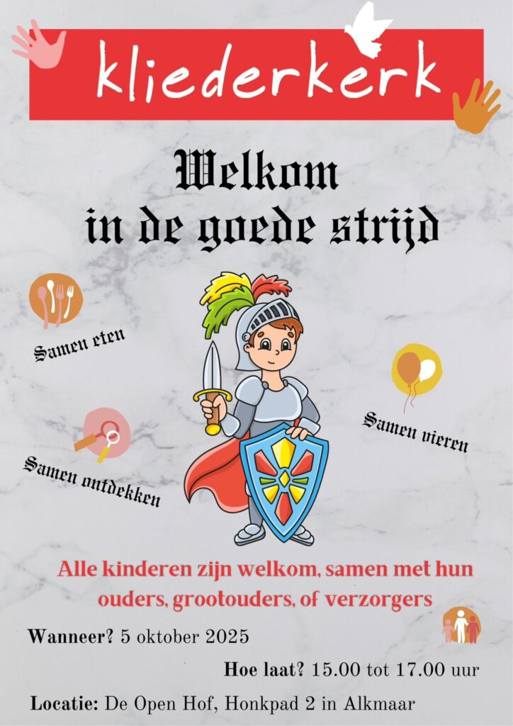 Een Kliederkerk is volop kerk, maar dan anders. Samen met jong en oud gaan we op een creatieve manier de betekenis van een Bijbelverhaal ontdekken. En het thema is deze keer: Welkom in de goede strijd. We gaan ontdekken dat de kerk bestaat uit veel verschillende mensen, die allemaal nodig zijn en elkaar nodig hebben…